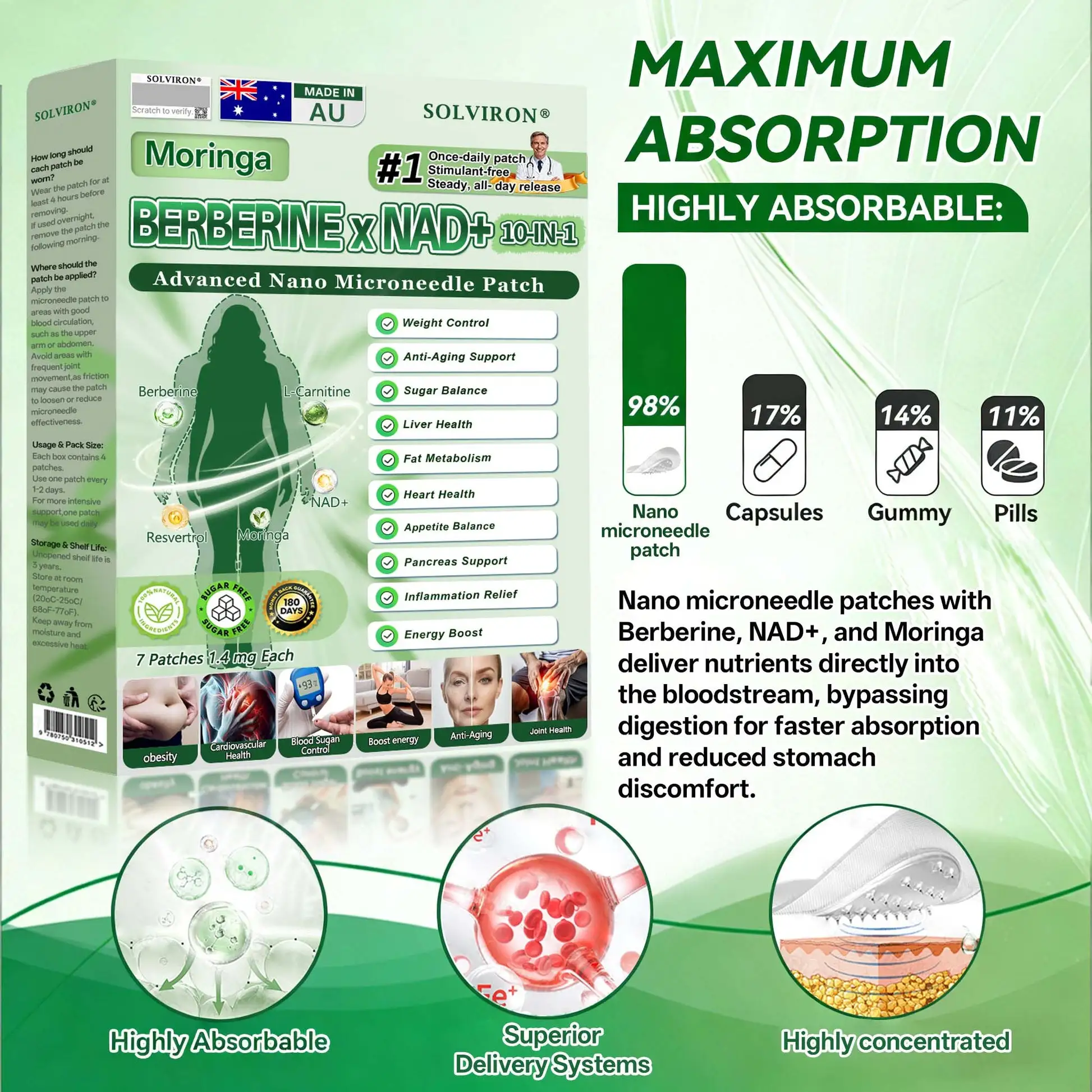 โ Easy Absorption: This formula uses an advanced nano microneedle patch delivery system. Combined with highly active ingredients such as berberine, it delivers key nutrients transdermally into the body, bypassing the digestive system and reducing gastrointestinal burden. The patch provides gentle, steady release for a more comfortable experience, making it especially suitable for individuals with sensitive digestion and those who prefer to avoid injectable weight-loss methods.